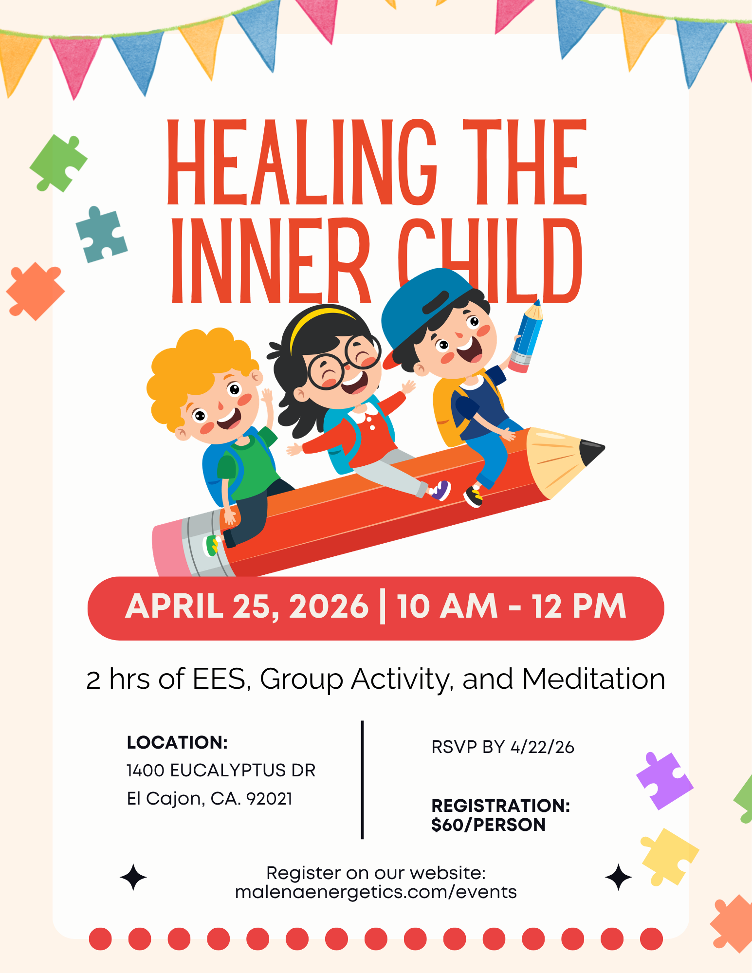 You will receive 2 hours of EESystem support, participate in an inner child related group activity (the flyer offers a clue), and 20 - 30 minute meditation.