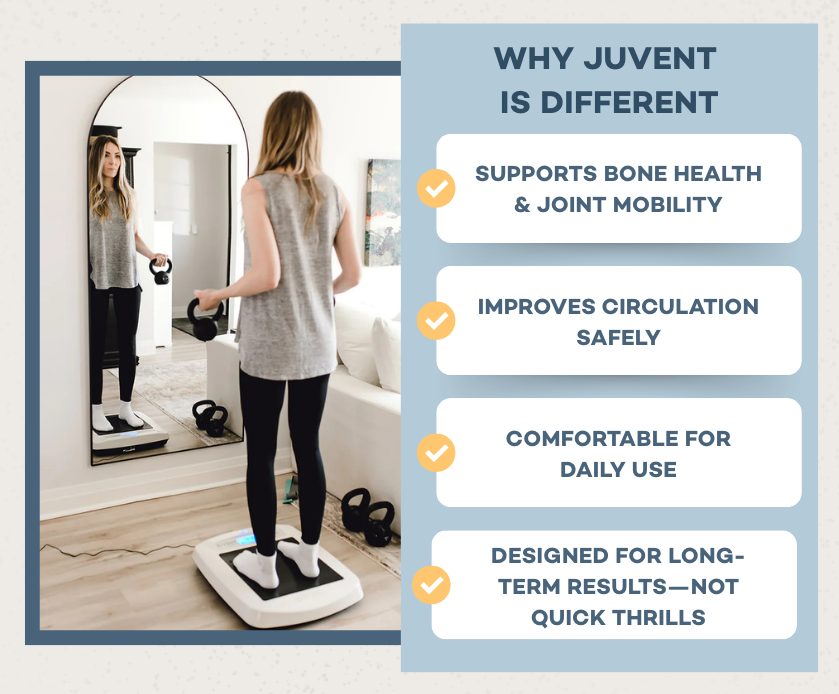 The patented Juvent Micro-Impact Platform® is a wellness device designed to deliver gentle, low-magnitude mechanical signals to the body.